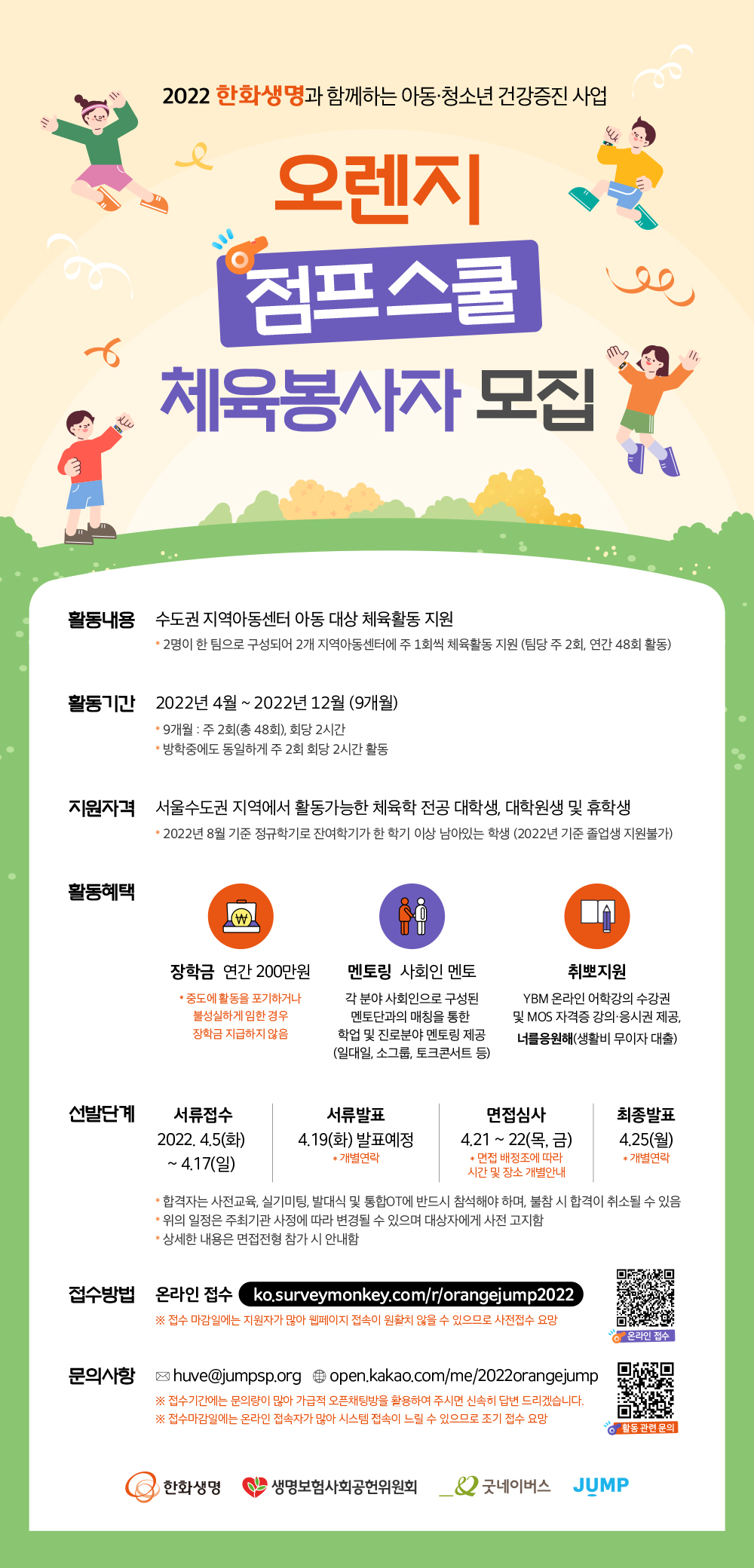 ‘2022 오렌지 점프클럽’ 은 체육전공 대학생이 직접 지역아동센터에 방문하여 체육활동을 가르치는 교육봉사로 활동기간은 2022년 4월부터 12월까지 진행됩니다.